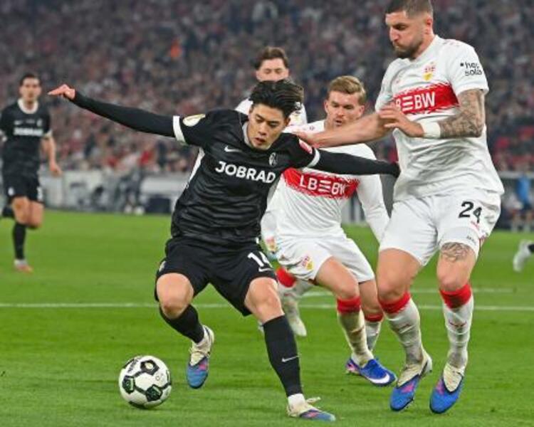 ドイツ・カップ準決勝でシュツットガルトに敗れ、肩を落とすフライブルクの選手たち=23日、シュツットガルト(ロイター=共同)