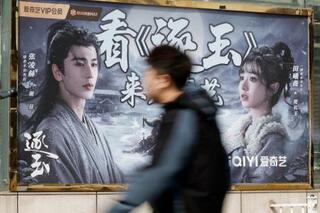 北京市内に設置された中国の恋愛時代劇「逐玉」を宣伝する看板。左は将軍役の俳優張凌赫さん=8日(共同)