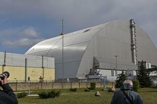 チョルノービリ原発を覆うシェルター=23日、ウクライナ北部(共同)