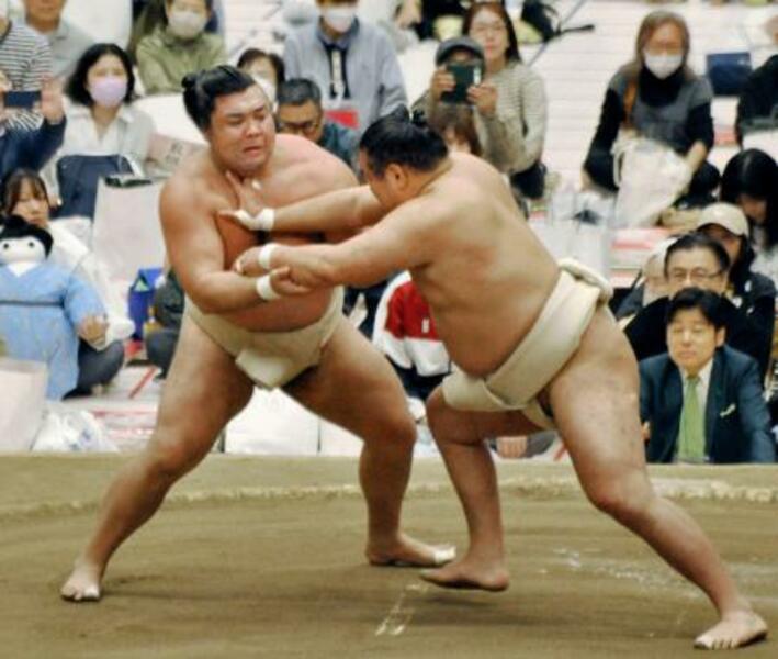 大相撲春巡業の朝稽古で、豊昇龍(右)と相撲を取る霧島=さいたま市