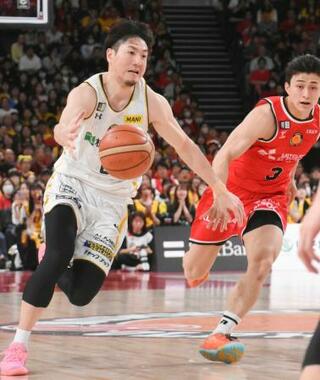 名古屋D戦で攻め込む宇都宮・比江島(左)=IGアリーナ