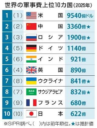 世界の軍事費上位10カ国