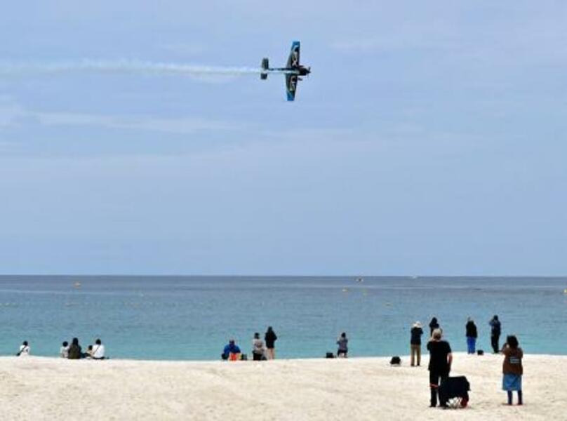「南紀白浜エアショー」で曲技飛行を披露する室屋義秀さんのプロペラ機=25日午前、和歌山県白浜町