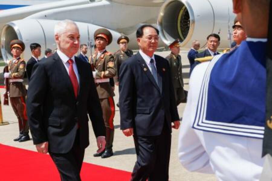 北朝鮮に到着したロシアのベロウソフ国防相(左)=26日(ロシア国防省提供・タス=共同)