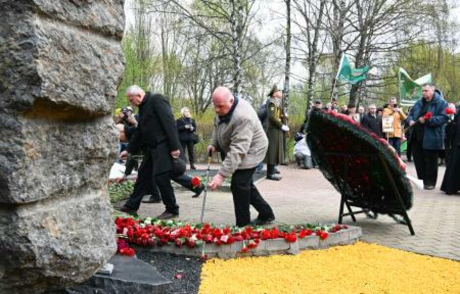 26日、ベラルーシ・ミンスクの追悼碑に花を手向ける「チェルノブイリ功労者の会」の人々(共同)