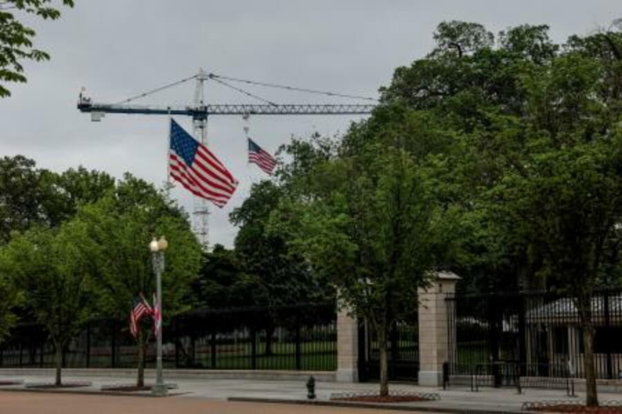工事のクレーンが架かるホワイトハウス=26日、ワシントン(ロイター=共同)