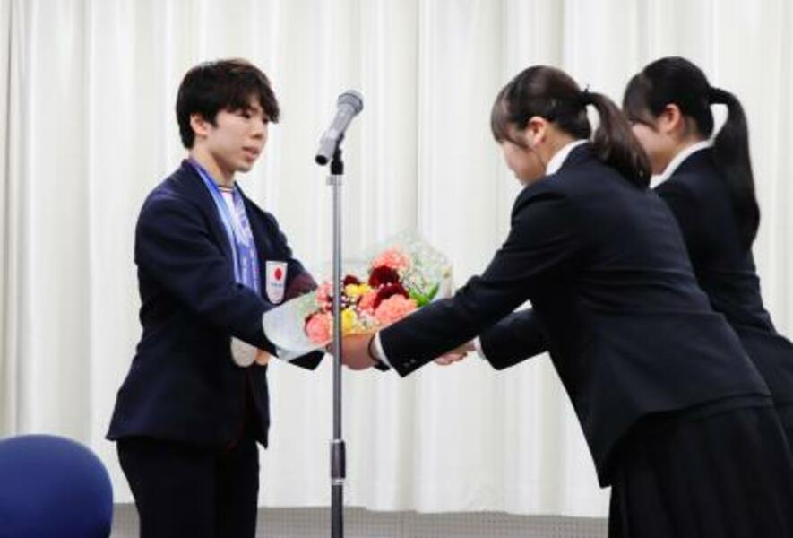 母校の埼玉栄高でミラノ・コルティナ冬季五輪の報告会を行い、花束を贈られるフィギュアスケート男子の佐藤駿=27日、さいたま市