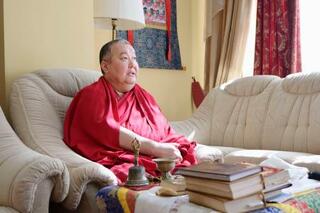 取材に応じる最高位僧侶のテンジン・チョイダクさん=3月、ロシア南部カルムイキア共和国エリスタ(共同)