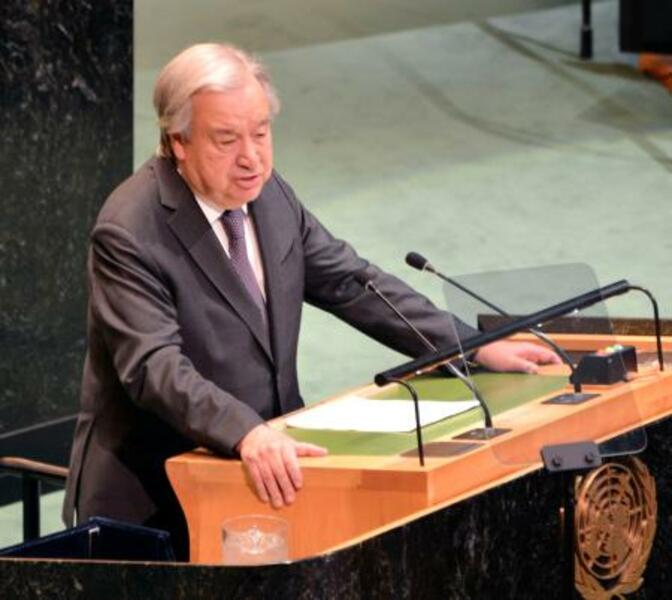核拡散防止条約(NPT)再検討会議で演説する国連のグテレス事務総長=27日、米ニューヨークの国連本部(共同)
