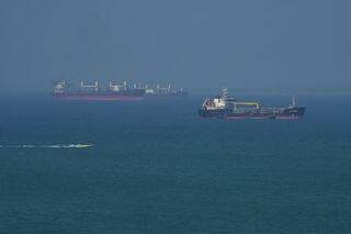 28日、イラン沖のホルムズ海峡に浮かぶ石油タンカー(ゲッティ=共同)