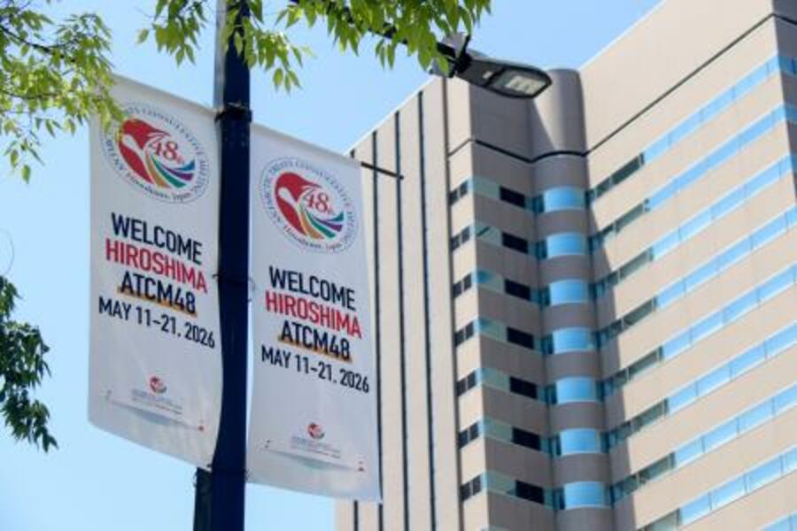 広島市の平和大通りに設置された南極条約協議国会議のバナー=27日
