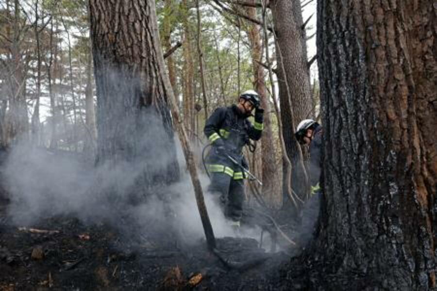 岩手県大槌町の山中で、消火活動する消防隊員=29日午前