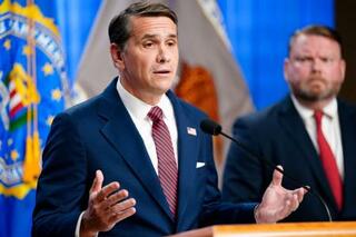 コミー元米連邦捜査局長官に対する、2度目の起訴を発表するブランチ米司法長官代行=28日、ワシントン(ロイター=共同)