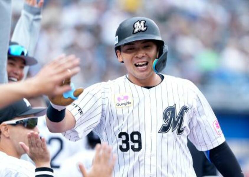 4回、勝ち越しソロを放ち迎えられるロッテ・井上=ZOZOマリン