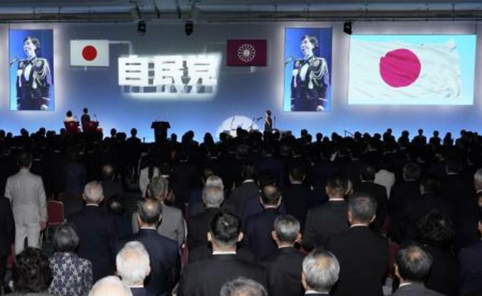 第93回自民党大会で行われた国歌斉唱。陸上自衛隊の女性隊員が務めた=4月12日、東京都内