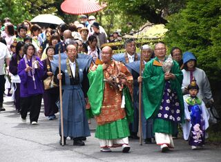ホラ貝を吹く僧を先頭に寺まで練り歩いた稚児行列