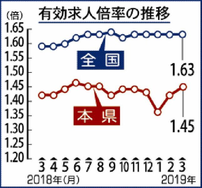 有効求人倍率1・45倍<br />県内3月 前月を0・03ポイント上回る
