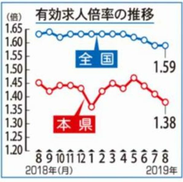 有効求人倍率1・38倍 <br />県内8月 3カ月連続減、求職者増<br />