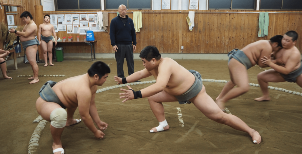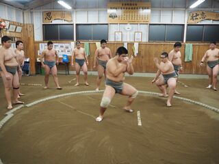 相撲部専用の建物で、立派な土俵もあります。そのなかで熱気伝わる練習をしています。