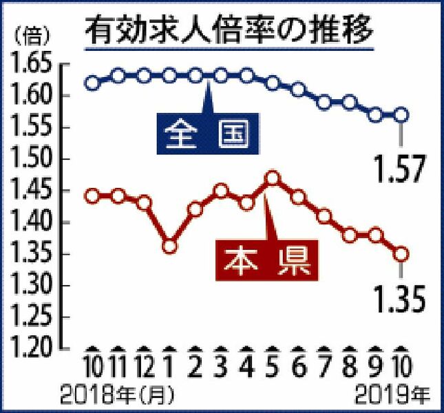 有効求人倍率1・35倍<br />10月県内 新規求人、製造業24%減