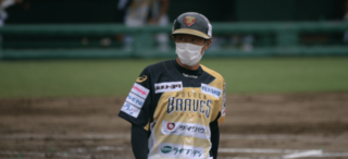 マスクをして一塁のコーチャーズボックスに向かう岡田幸文外野守備走塁コーチ