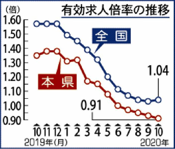 有効求人倍率0・91倍<br />県内10月 コロナで8カ月連続低下