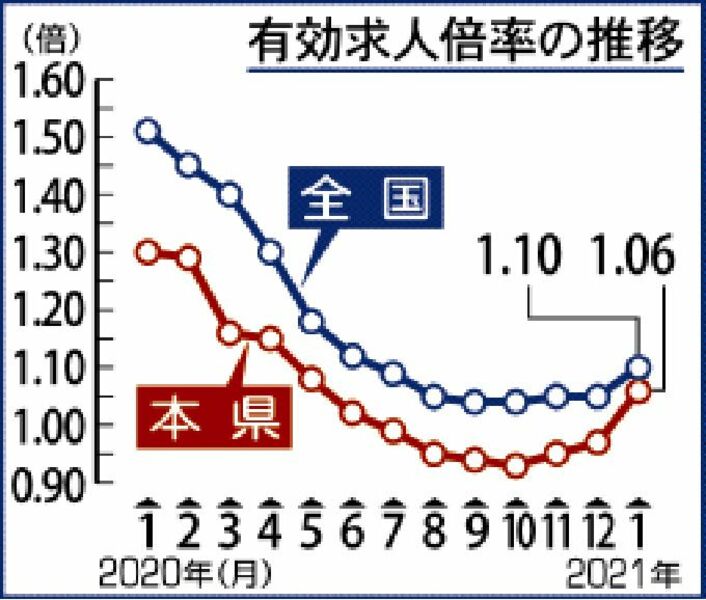 有効求人倍率1・06倍<br />県内1月 緊急事態宣言で求職鈍る