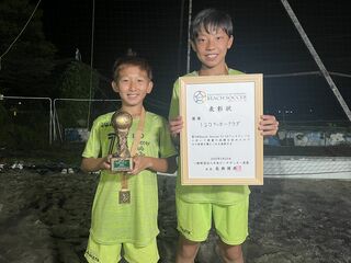今年3月のビーチサッカーU-12フェスティバルで優勝したメンバーである齋藤 仁我さん、畑野 由樹さん(左から)