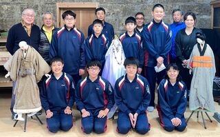 昨年「奈佐原文楽」の活動を行った鹿沼市立北押原中学校創作部の生徒たち。左から元副部長の横山 裕紀(ゆうき)さん、 元創作部部長の本間 結平(きっぺい)さん、三品 遼太(りょうた)さん、島田 愛里(あいり)さん
