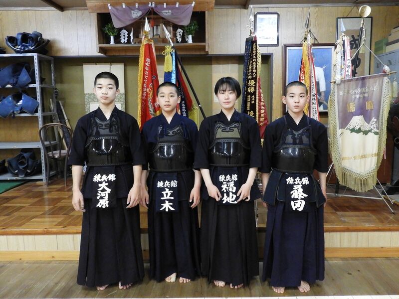 2019年7月の「全国道場少年剣道大会」の小学生団体の部で準優勝をしたメンバー。左から大河原さん、立木 伶(れい)さん、福地さん、藤田 悠叶(はやと)さん