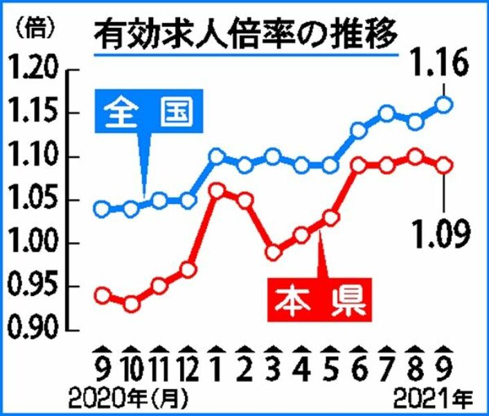 有効求人倍率1・09倍<br />県内9月 横ばい、製造業は急増