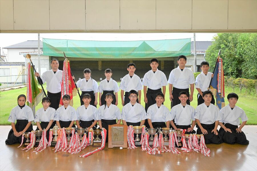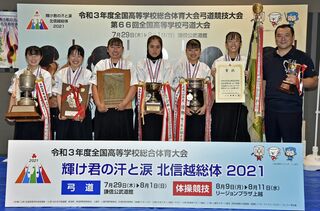 昨年のインターハイで弓道女子団体で優勝した足利大学附属高校弓道部。顧問の宮澤教諭(右端)