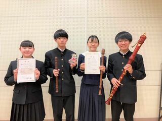 第43回「全日本リコーダーコンテスト高校生・重奏の部」で最高賞となる「花村賞」を獲得した4人。左から大竹 美由紀(おおたけ・みゆき)さん、板橋 瞳(いたばし・ひとみ)さん、菅 万結子(すが・まゆこ)さん、姜 映在(かん・よんじぇ)さん