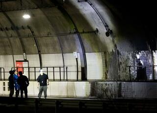 新名神高速道路下り線の野登トンネル出口付近を調べる捜査員=24日夜、三重県亀山市