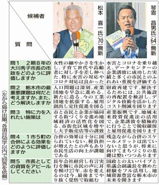 栃木市長選候補者アンケート 市の最重要課題と解決策、1市5町合併の評価…