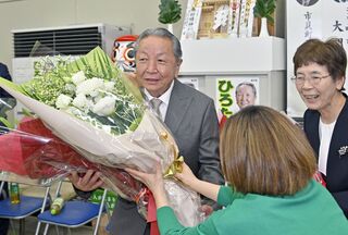 再選を果たし、支持者から花束を受け取る広田茂十郎氏(左)=12日午後8時25分、益子町益子、広瀬華撮影
