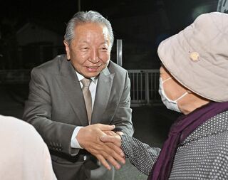 再選を果たし、支持者と握手する広田茂十郎氏=12日午後8時35分、益子町益子、広瀬華撮影