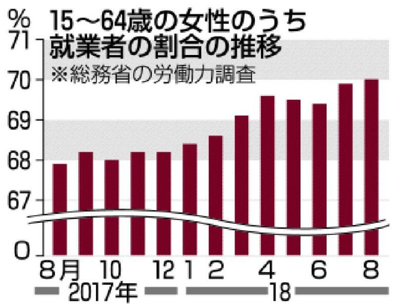 女性就業率、初の7割 <br />総務省8月調査 2962万人、過去最多 賃金など男性と依然格差