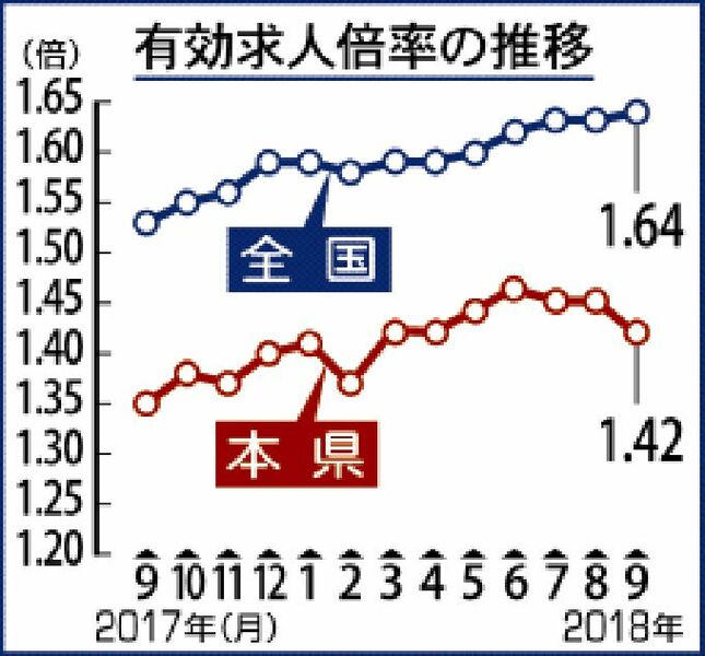 有効求人倍率減1.42倍<br />県内9月 雇用「改善進む」維持