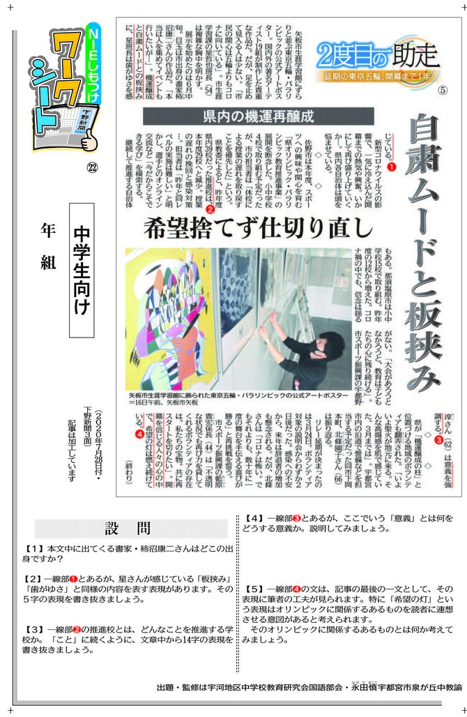 下野新聞の記事を使って社会への関心や読解力を高める「ワークシート」をスタートします。出題するのは、県小・中・高校教育研究会の国語・社会部会に所属する教員たち。ぜひ挑戦してください。