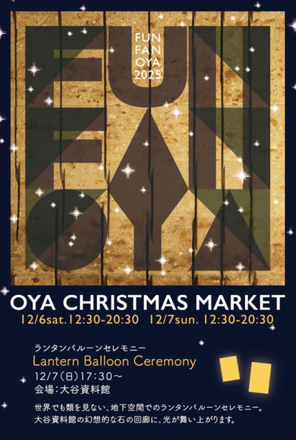 今年も開催!「FUN FAN OYA 2025 OYA CHRISTMAS MARKET」。ファンファンパーティでは景観公園がダンスフロアに変身!みんなでDJプレイの音楽にのって楽しく踊ろう。7日のランタンバルーンセレモニーでは、世界でも類を見ない、地下空間でのセレモニー。大谷資料館の幻想的な石の回廊に光が舞い上がる。両日とも飲食等のブースも充実。大谷で寒さを吹き飛ばし、楽しいひとときを過ごそう!