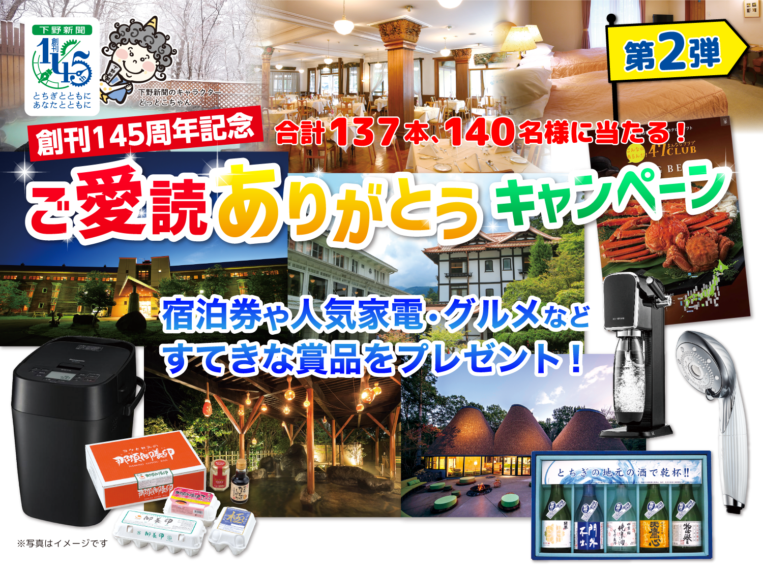 下野新聞は6月1日、創刊145周年を迎えました。これを記念し、日ごろ下野新聞をご愛読いただいている皆さんや新規購読される方を対象にした「創刊145周年記念・ご愛読ありがとうキャンペーン第2弾」を実施いたします。県内の温泉地などでご利用いただける宿泊券や家電製品などを用意しました。奮ってご応募ください。