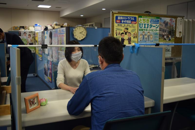 就職氷河期世代支援相談窓口で対応する相談員(左)=15日午後、宇都宮市