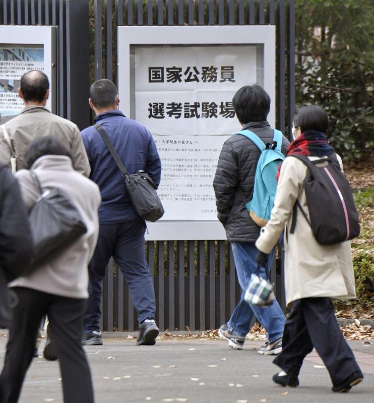 「就職氷河期世代」を対象とした国家公務員中途採用試験の会場に向かう受験者ら=29日午前、東京都武蔵野市