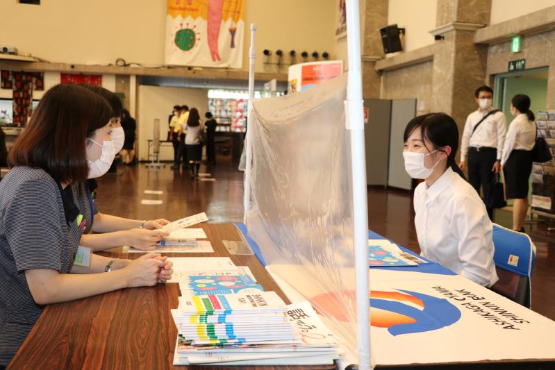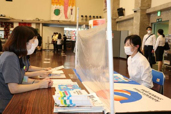 企業の説明を笑顔で聞く学生