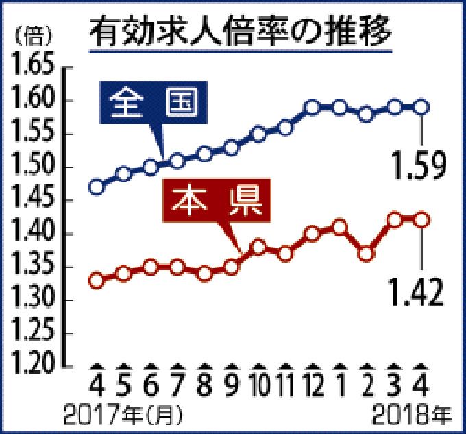 有効求人倍率1・42倍 県内4月、前月と同水準