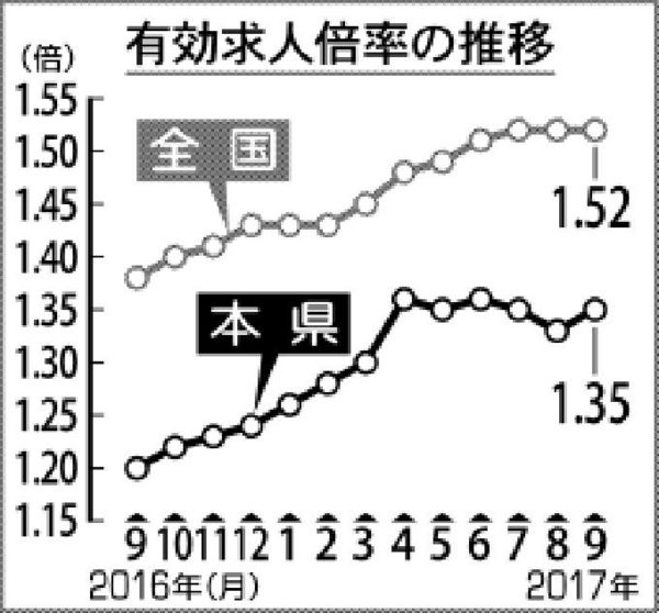 有効求人倍率1.35倍 県内9月、堅調に推移