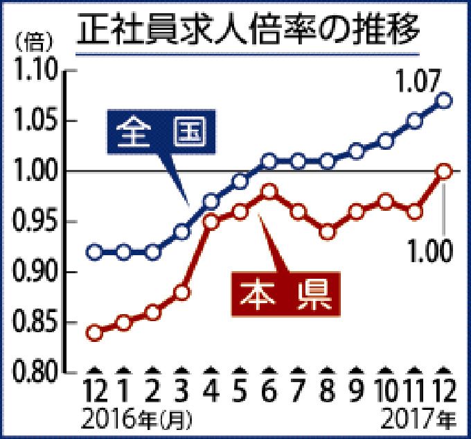正社員求人 初の1倍 県内12月 有効倍率、10年ぶり高水準