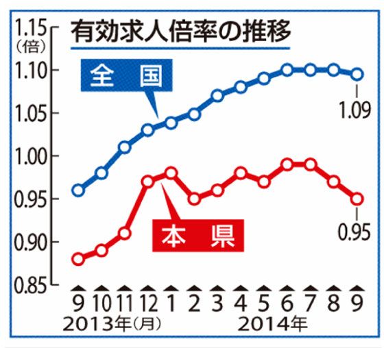 求人倍率0・95倍/県内9月、2カ月連続悪化