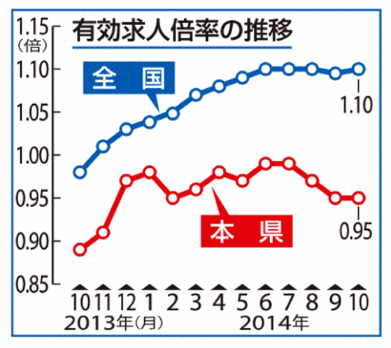 求人倍率県内10月/前月と同じ0・95倍/新規求人数2カ月連続増